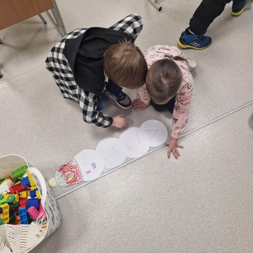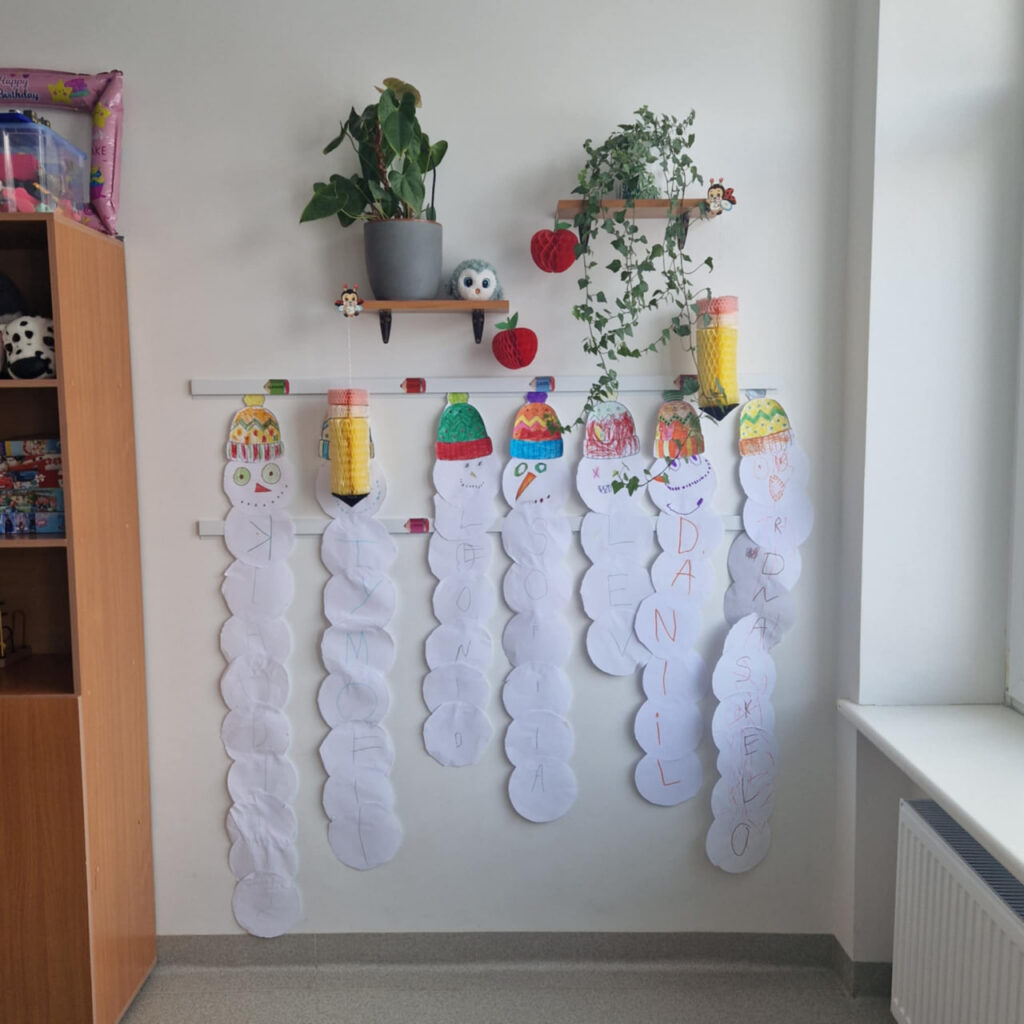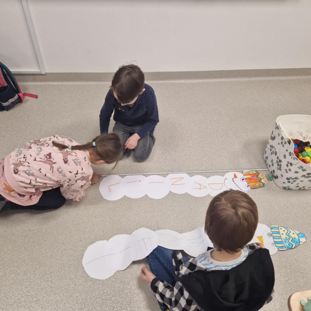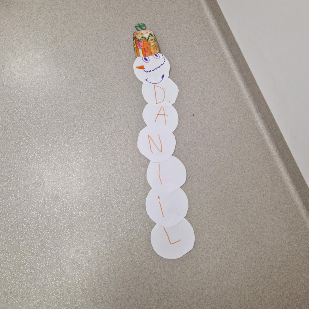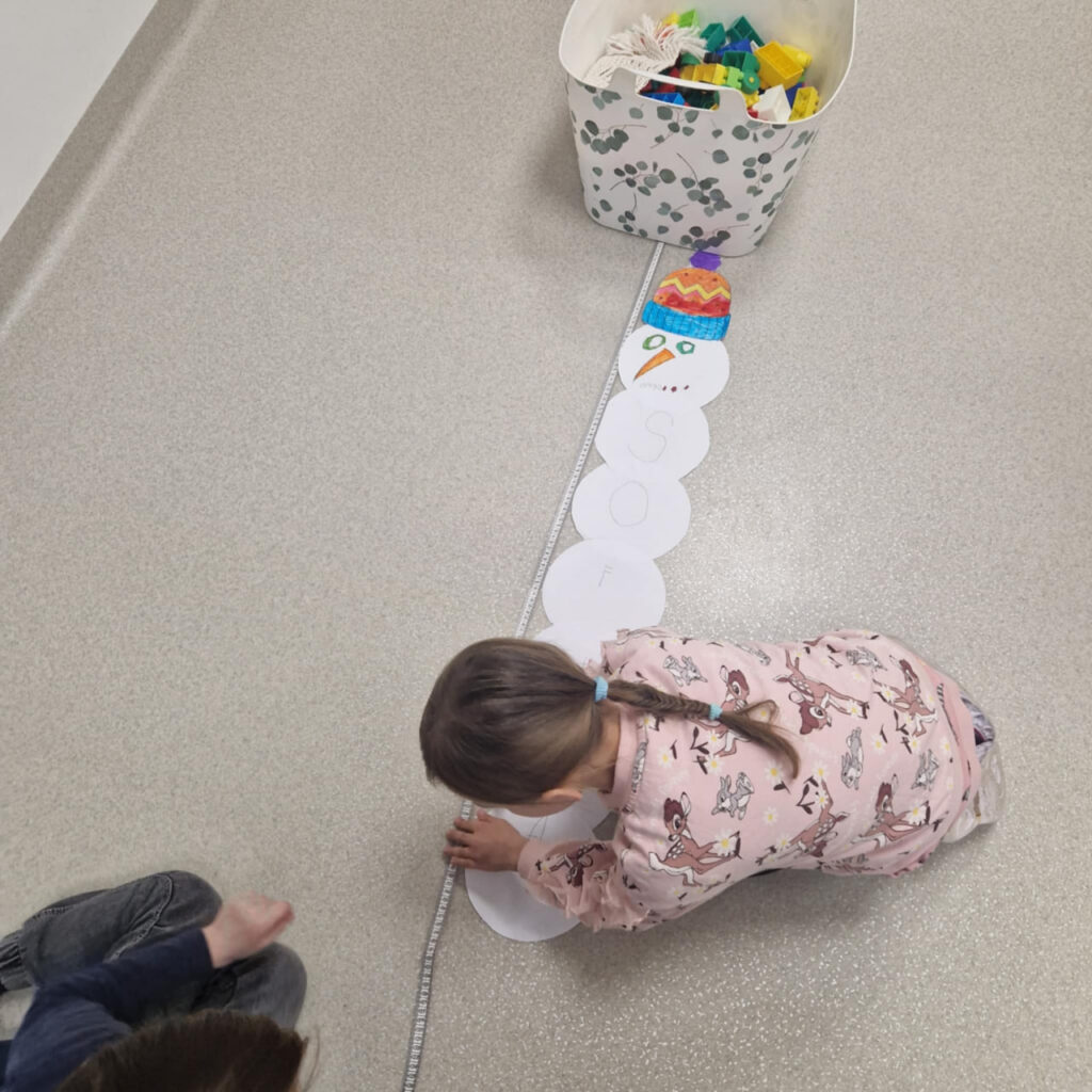 Vaikai kūrė sniego senius iš popieriaus – tačiau tai nebuvo tik kūrybinė užduotis. Kiekvienas sniego senis buvo sudarytas iš tiek apskritimų, kiek raidžių sudaro vaiko vardą. Ant kiekvieno apskritimo vaikai užrašė po vieną raidę, vėliau pagamino galvą, nupiešė veidą ir uždėjo kepurę. Taip kiekvienas ugdytinis sukūrė savo unikalų, vardinį sniego senį. Po kūrybinės dalies prasidėjo tyrinėjimas. Vaikai matavo, kurio sniego senis yra aukščiausias, lygino rezultatus, diskutavo, kaip apskritimų skaičius ir jų dydis veikia sniego senio aukštį. Veiklų metu ugdėsi matavimo, lyginimo, analizavimo ir išvadų darymo gebėjimus. Veikla vyko draugiškoje atmosferoje, bendradarbiaujant ir patenkinant savo smalsumą.