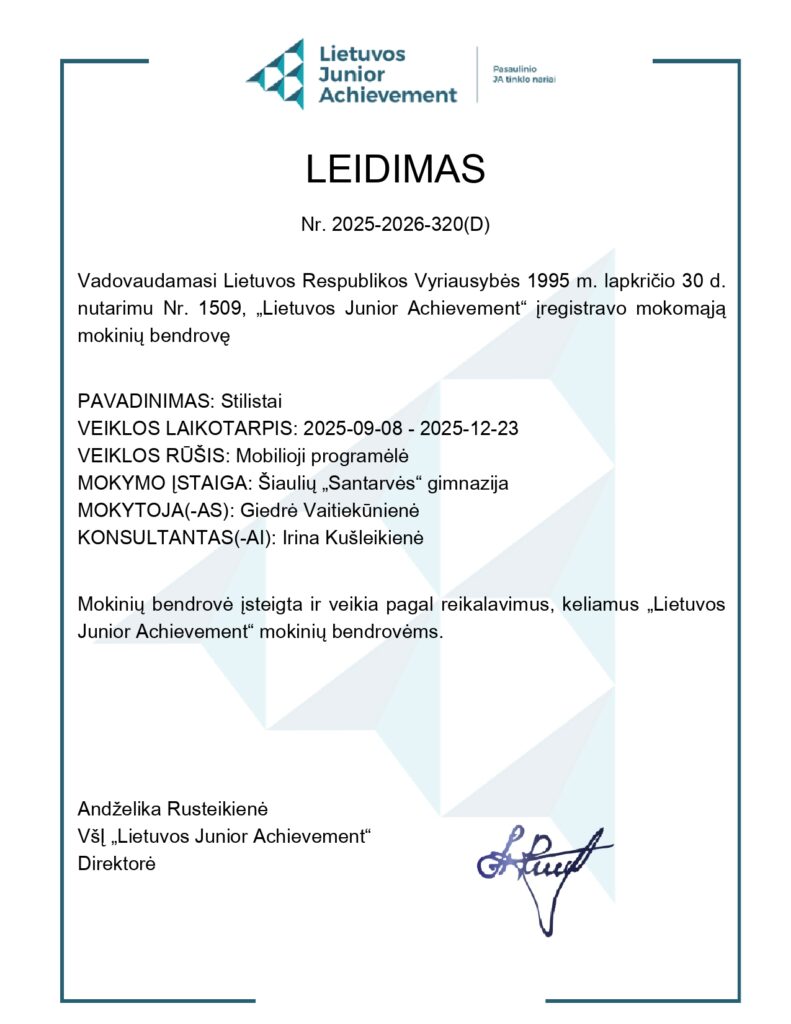 Didžiuojamės, kad renginyje sėkmingai dalyvavo Šiaulių „Santarvės“ gimnazijos 5 klasės mokinių komanda „Stilistai“ (Anhelina D., Ksenija B., Dominykas B.). Komanda sukūrė mobiliąją programėlę „Įvaizdžio kūrimo asistentas“, kurioje pristatė savo sukurtus sprendimus ir pasiūlė aprangos stilius įvairioms progoms. Šis projektas ir dalyvavimas Kalėdinėje „accelerator_x“ eXpo parodoje dar kartą patvirtino, kad kryptingas verslumo ir skaitmeninių kompetencijų ugdymas mokykloje duoda apčiuopiamų rezultatų.